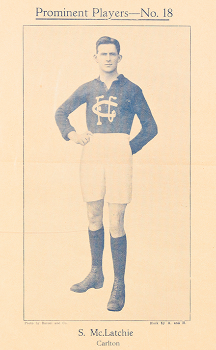 1921 SPORTING LIFE & THE BAYONET "PROMINENT PLAYERS" No.18 "S.McLATCHIE, CARLTON", 25x38cm. G/VG .