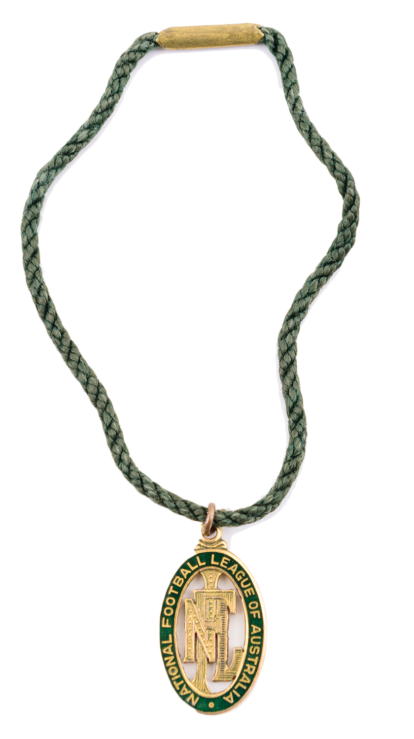 NATIONAL FOOTBALL LEAGUE OF AUSTRALIA BADGE: 9CT GOLD & ENAMEL BADGE, ENGRAVED ON REVERSE "NATIONAL DIRECTOR OF COACHING", MADE BY K.G.LUKE.