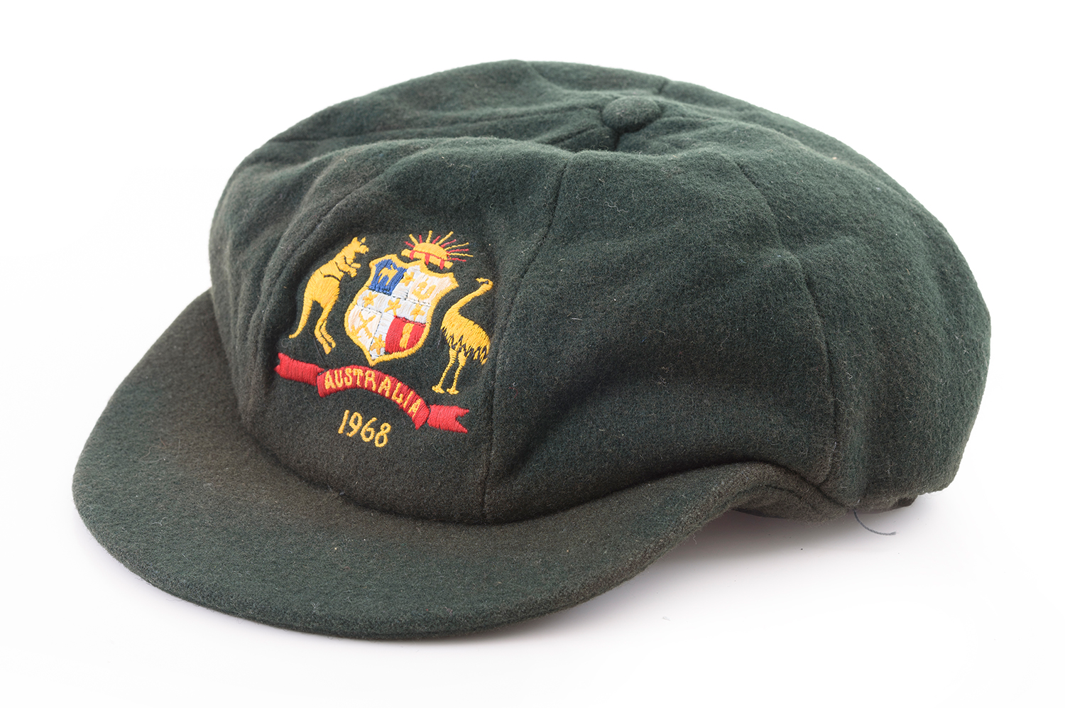 ALAN CONNOLLY'S 1968 "BAGGY GREEN" AUSTRALIAN TEST CAP, GREEN WOOL WITH EMBROIDERED COAT-OF-ARMS & "1968" ON FRONT, LABEL INSIDE ENDORSED "AC". [ALAN CONNOLLY PLAYED 29 TESTS 1963-71].