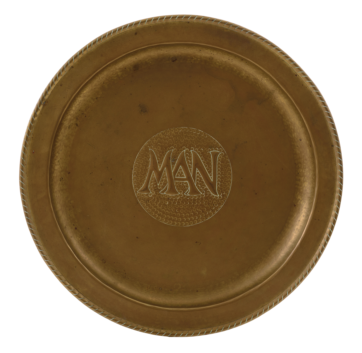 CIRCULAR COPPER PRESENTATION TRAY WITH MONOGRAM "MAN" AT CENTRE. EX MONTY NOBLE COLLECTION.