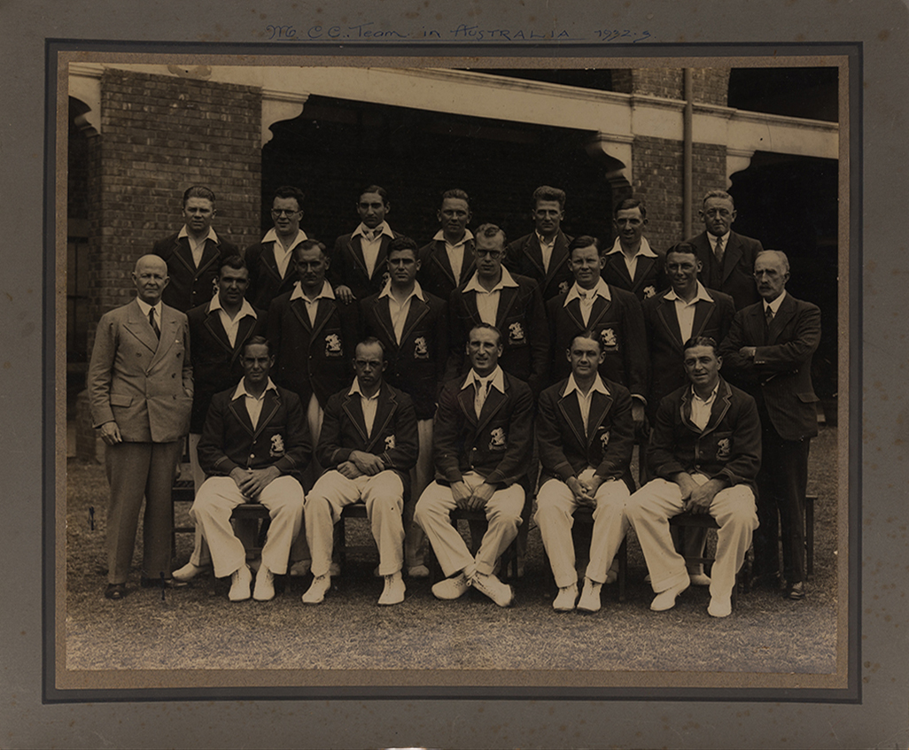 1932-33 ENGLAND "BODYLINE" TEAM, TEAM PHOTOGRAPH OF THE PLAYERS IN THEIR BLAZERS, ENDORSED AT TOP "MCC TEAM IN AUSTRALIA 1932-3", OVERALL 46X38CM. EX MONTY NOBLE COLLECTION.