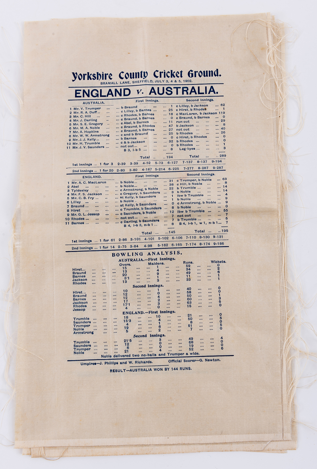 1902 AUSTRALIAN TOUR TO ENGLAND: SILK SCORECARDS FOR 3RD TEST (NOBLE 6/51 & 4/52) & 5TH TEST (3). EX MONTY NOBLE COLLECTION.