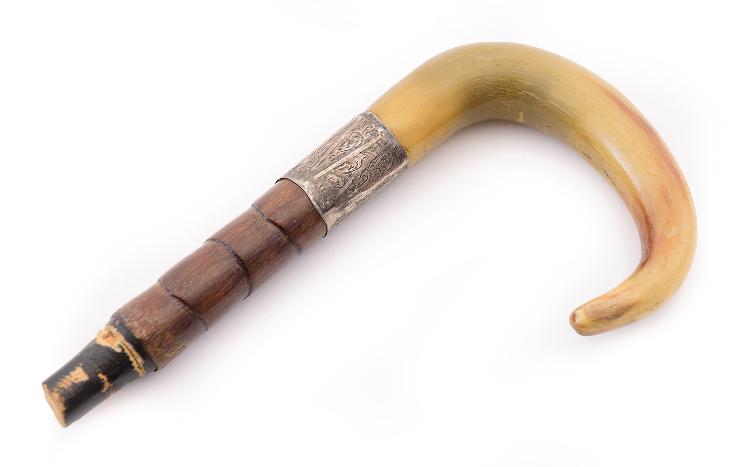 Walking stick cut off 4 inches (10cm) below handle. Silver collar very worn.