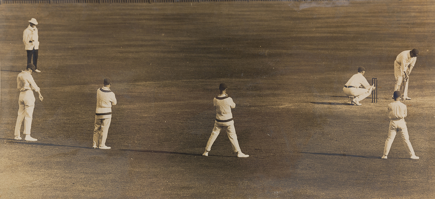 ACTION PHOTOGRAPH OF MONTY NOBLE BATTING IN ENGLAND; PLUS PHOTO OF SLIPS CORDON (BATSMAN WEARING SKELETON PADS).