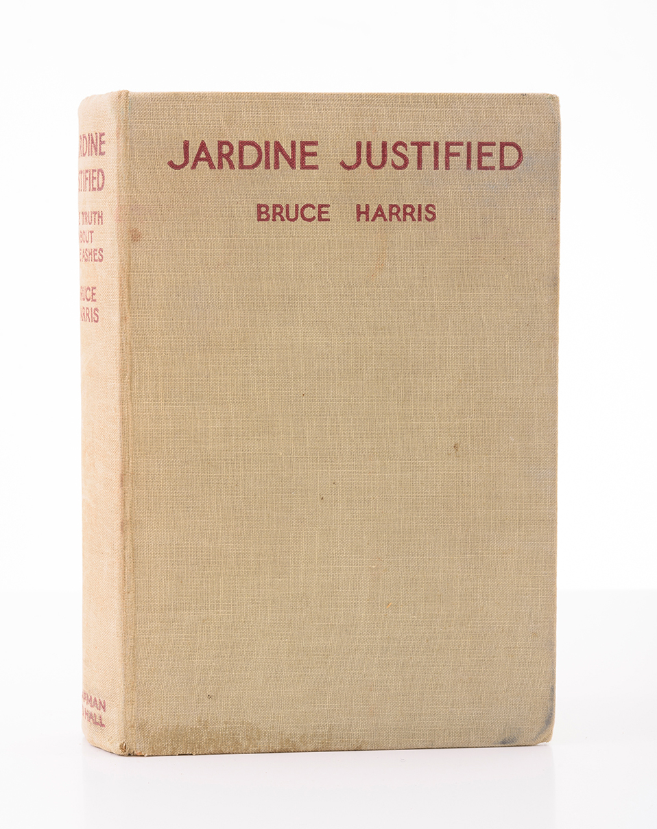 "JARDINE JUSTIFIED" BY BRUCE HARRIS [LONDON, 1933] WITH ENCLOSED LETTER FROM AUTHOR TO SCORER BILL FERGUSON.