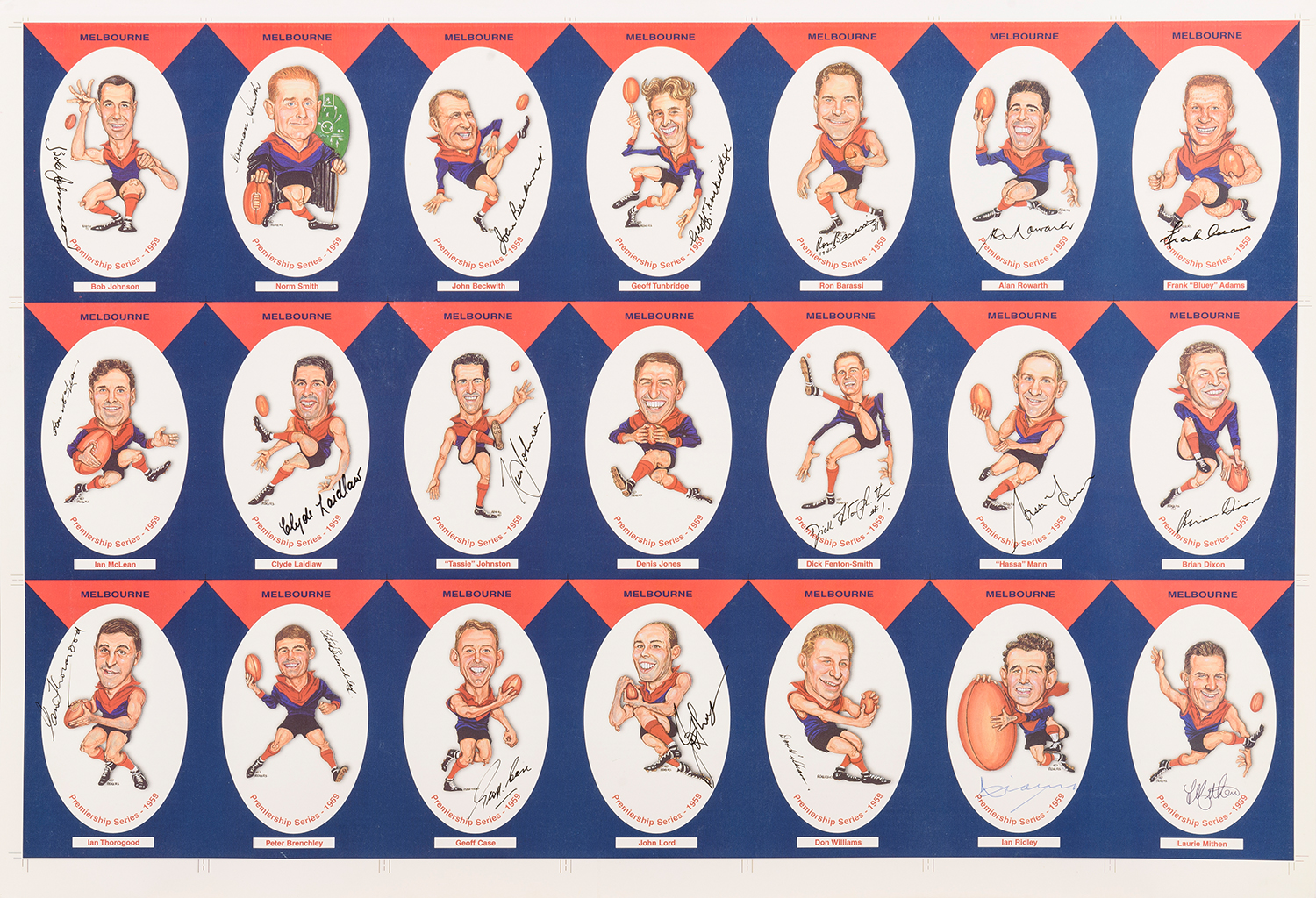 1999 PIG SKIN PROMOTIONS "MELBOURNE PREMIERSHIP SERIES 1959", COMPLETE SET [21] IN UNCUT SHEET, WITH 20 CARDS SIGNED INCLUDING RON BARASSI, NORM SMITH & HASSA MANN.