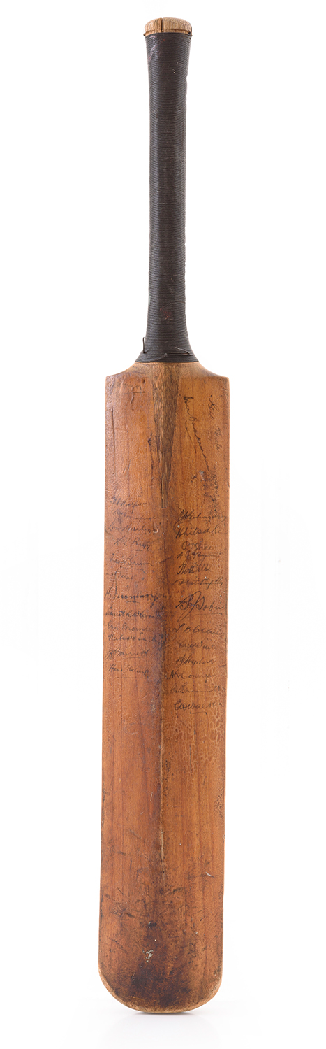 1933 VICTORIA V SOUTH AUSTRALIA, SIZE 4 CRICKET BAT SIGNED BY DON BRADMAN, BOTH TEAMS & UMPIRE. NOTED BILL WOODFULL, BILL PONSFORD & VIC RICHARDSON.