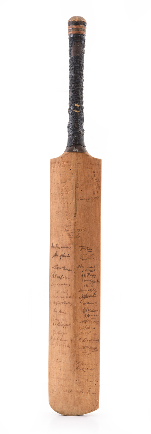 A FULL SIZE SIGNED CRICKET BAT FROM THE 1936-37 AND 1954-55 TEST SERIES, SIGNED BY THE AUSTRALIAN AND ENGLISH TEAMS FROM THE 1936-37 AND 1954-55 ASHES SERIES