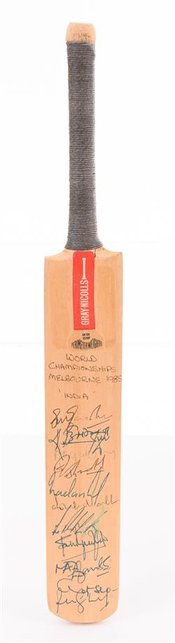 MINIATURE CRICKET BATS, ONE SIGNED BY INDIA 1985, OTHER SIGNED BY ZIMBABWE, A TOTAL OF 26 SIGNATURES INCLUDING SUNIL GAVASKAR