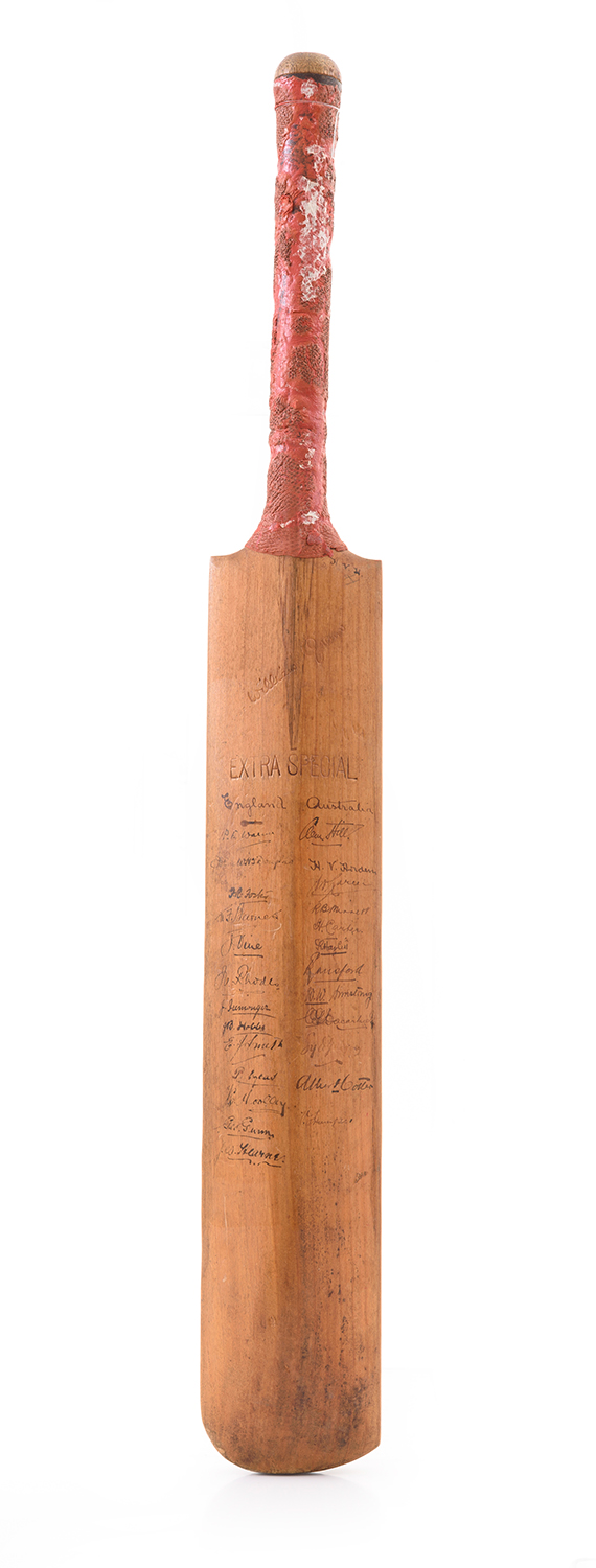 "GUNN & MOORE" CRICKET BAT OWNED BY DR HERBERT V. "RANJI" HORDERN, SIGNED BY 1911-12 ENGLAND & AUSTRALIA TEAMS DURING FIFTH TEST AT SCG, WITH A TOTAL OF 23 SIGNATURES INCLUDING CLEM HILL, VICTOR TRUMPER, WARWICK ARMSTRONG, SYD GREGORY & HERBERT HORDERN