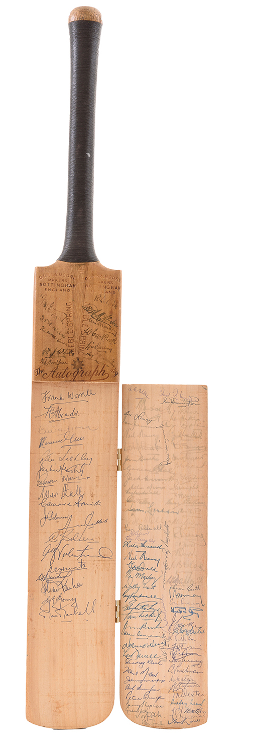 "GUNN & MOORE" CRICKET BAT WITH PIECE CUT-OUT, SHOWING C 235 SIGNATURES ON FRONT, REVERSE AND INSIDE, INCLUDING 1921 AUSTRALIA & ENGLAND TEAMS, 1948 INVINCIBLES, 1960-61 WEST INDIES AND A RANGE OF C1900-20 ENGLISH TEST PLAYERS. NOTED 18 AUSTRALIAN CAPTAINS COMPRISING DON BRADMAN, JOE DARLING, CLEM HILL, WARWICK ARMSTRONG & RICHIE BENAUD, EX JACK RYDER.