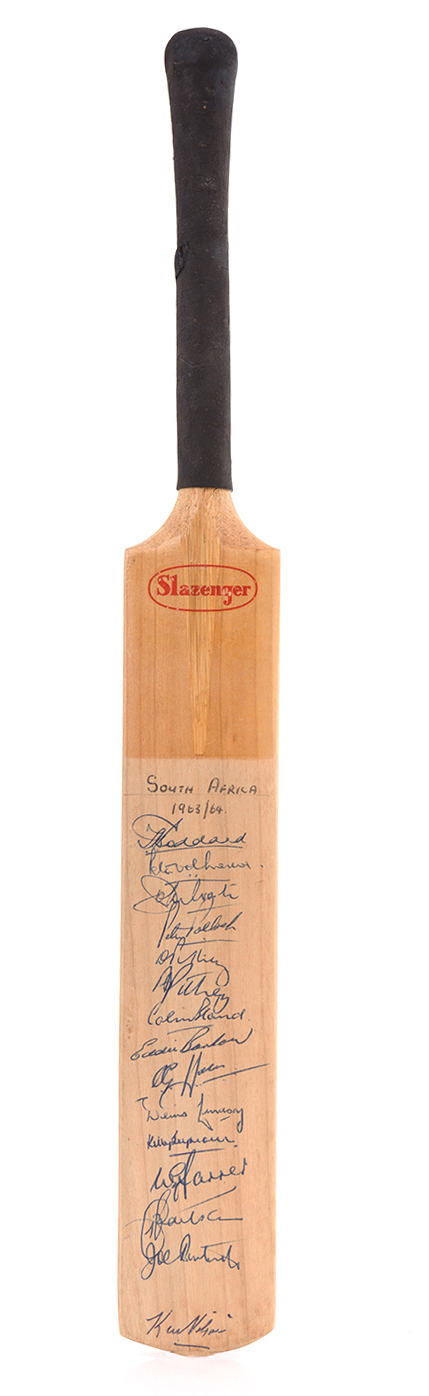 1963-64 SOUTH AFRICA TOUR TO AUSTRALIA, MINIATURE CRICKET BAT SIGNED BY SOUTH AFRICA TEAM ON FRONT AND AUSTRALIAN TEAM ON REVERSE, A TOTAL OF 27 SIGNATURES INCLUDING RICHIE BENAUD, BOB SIMPSON & ALAN CONNOLLY. EX ALAN CONNOLLY COLLECTION