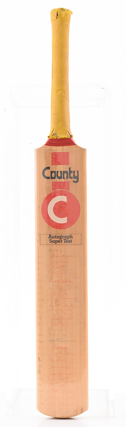 "COUNTY - AUTOGRAPH SUPER TEST" CRICKET BAT SIGNED BY 1986-87 AUSTRALIA & ENGLAND TEAMS; A TOTAL OF 24 SIGNATURES INCLUDING BORDER, JONES, MCDERMOTT, BOON, MARSH & STEVE WAUGH. THE ENGLISH SIDE INCLUDED GATTING, BROAD & EMBUREY