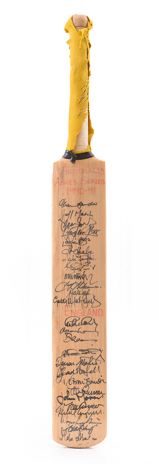 CRAIG MCDERMOTT'S "GABBA" CRICKET BAT SIGNED BY THE 1990-91 AUSTRALIA & ENGLAND TEAMS: A TOTAL OF 26 SIGNATURES INCLUDING BORDER, BOON, MCDERMOTT, JONES, MARSH, TAYLOR & BOTH WAUGHS. RUBBER HANDLE PERISHING THOUGH AUTOGRAPHS FINE