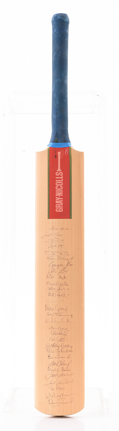 1988 BICENTENNIAL TEST, FULL SIZE "GRAY-NICHOLLS" CRICKET BAT, SIGNED BY AUSTRALIA & ENGLAND TEAMS, WITH 28 SIGNATURES INCL. ALLAN BORDER, DAVID BOON & MIKE GATTING. EX GEOFF MARSH COLLECTION.