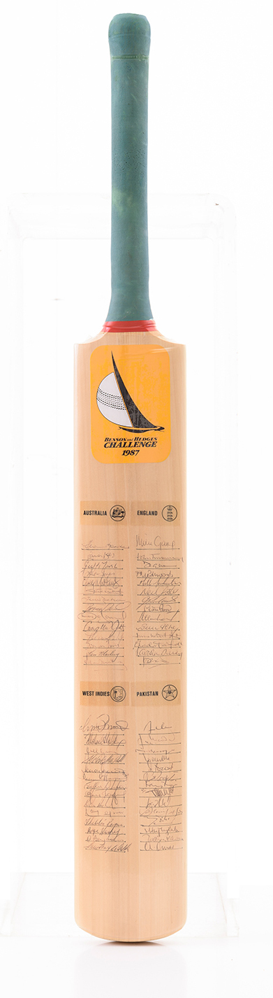 1987 BENSON & HEDGES CHALLENGE CUP, FULL SIZE CRICKET BAT WITH SPECIAL LABEL, SIGNED BY AUSTRALIA, ENGLAND, WEST INDIES & PAKISTAN TEAMS, WITH A TOTAL OF 56 SIGNATURES INCLUDING ALLAN BORDER, MIKE GATTING, IMRAN KHAN & VIV RICHARDS. SUPERB CONDITION