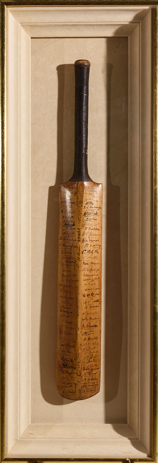 FULL SIZE CRICKET BAT FROM A 1911 CHARITY MATCH, SIGNED ON REVERSE BY 80 ENGLISH CRICKETERS (ABOUT HALF TEST PLAYERS), NOTED TOM RICHARDSON, T.HAYWARD, J.B.HOBBS, J.W.H.T.DOUGLAS, C.B.FRY, J.W.HEARNE, J.T. TYLDESLEY, F.E. WOOLLEY, G.H. HIRST, W.RHODES, A.C.MACLAREN & P.F.WARNER, FRAMED & GLAZED IN DISPLAY CASE, OVERALL 38 X 113 CM. SUPERB AND UNIQUE PIECE FROM THE GOLDEN AGE OF CRICKET