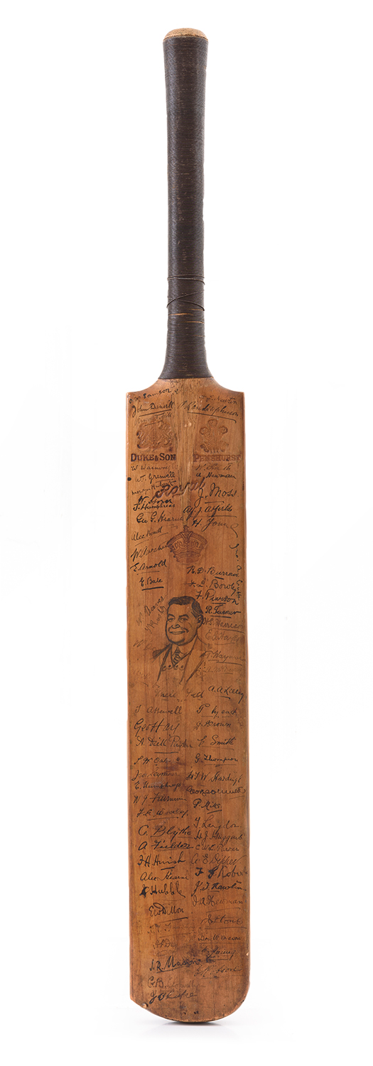 C1890S-1910 "DUKE & SON" FULL SIZE CRICKET BAT, WITH CARICATURE OF UNCLE TED ON FRONT, AND SIGNED ON FRONT AND REVERSE BY C 154 CRICKETERS, NOTED GEORGE HEARNE, FRANK WOOLLEY, GEORGE HIRST, A.A. LILLEY, JOSEPH HARDSTAFF, JOHN & GEORGE GUNN, LORD HAWKE AND NINE OF THE 1909 AUSTRALIAN TEAM INCLUDING VICTOR TRUMPER, WARWICK ARMSTRONG & WARREN BARDSLEY