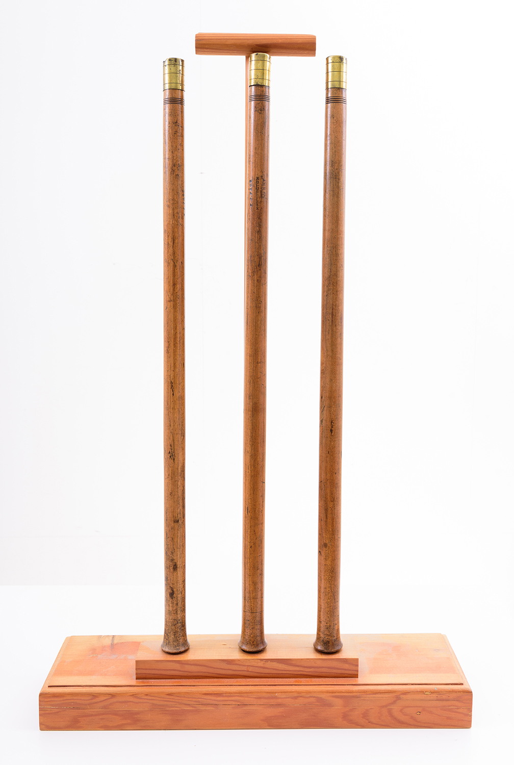 C1900 SET OF 3 VICTORIAN CRICKET STUMPS, WITH SHAPED BRASS BANDS AT TOP, HANDSTAMPED BY MAKER "E.J PAGE, KENNINGTON, SURREY", WITH PURPOSE BUILT WOODEN DISPLAY STAND TO HOLD STUMPS PLUS TWO BATS AND BALL
