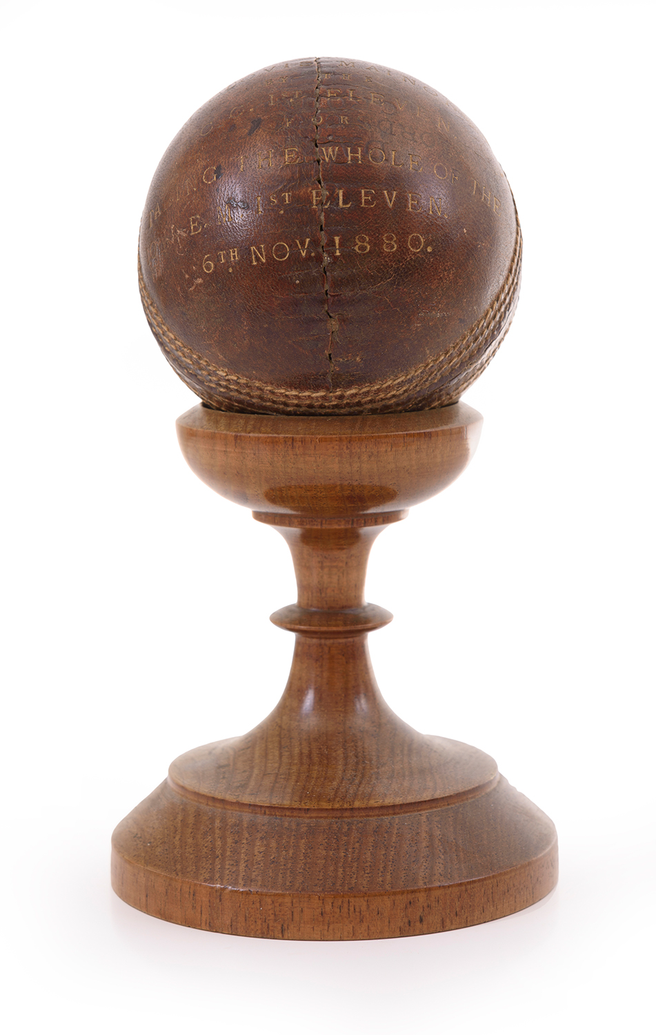 A CRICKET BALL, WITH TEXT "PRESENTED TO MR CLOVIS MAINON BY THE R.C.C. 1ST ELEVEN, FOR TAKING THE WHOLE OF THE I.O. E.M. 1ST ELEVEN, 6TH NOV. 1880." ON WOODEN STAND