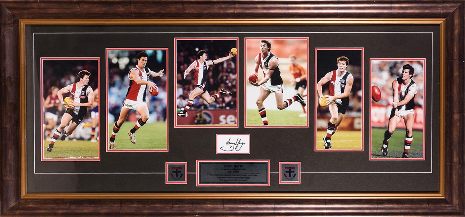 LENNY HAYES (ST KILDA), 200TH GAME DISPLAY WITH SIGNED CARD, WINDOW MOUNTED WITH SIX ACTION PICTURES, 135 X 63 CM