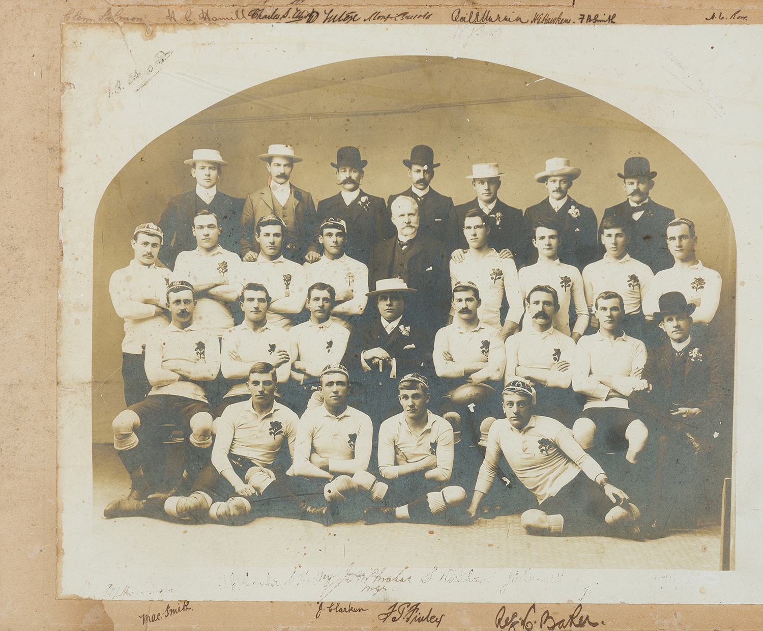 NSW AUSTRALIAN RUGBY UNION TEAM PHOTOGRAPH 1904, SIGNED INCLUDING SNOWY BAKER AND MANY OF THE FAMOUS 1ST WALLABIES TO THE UK IN 1908. FRAMED IN BIRD'S EYE MAPLE. (On view only in Sydney, items to be collected from Sydney at purchasers expense).