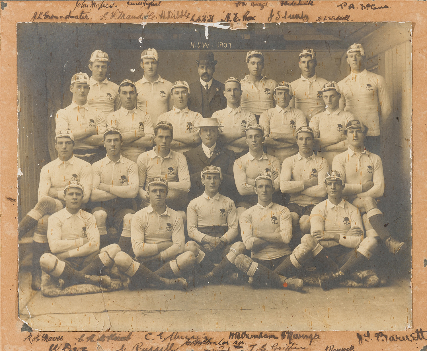 1907 NSW/AUSTRALIAN RUGBY UNION TEAM PHOTOGRAPH V NEW ZEALAND. SIGNED INCLUDING DALLY MESSENGER. [THIS WAS DALLY MESSENGER'S LAST RU GAME. THIS NSW TEAM DEFEATED NZ IN THE LAST GAME AUG.1907. IT WAS LATER IN AUGUST THAT MESSENGER JOINED THE NZ "ALL GOLDS" (RL) TO PLAY THE 1ST RUGBY LEAGUE MATCH IN SYDNEY. BEAUTIFULLY FRAMED IN BIRD'S EYE MAPLE. (On view only in Sydney, items to be collected from Sydney at purchasers expense).