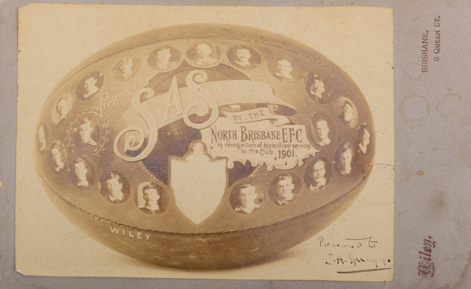 EARLY RUGBY UNION PHOTOGRAPHIC CABINET CARD BY WILEY OF BRISBANE, PRESENTED TO S.A.SPRAGG BY THE NORTH BRISBANE F.C. 1901. [LONNIE SPRAGG PLAYED IN THE INAUGURAL RUGBY TEST MATCH FOR AUSTRALIA IN 1899. HE DIED IN FEB.1904 AT THE AGE OF 25]. (On view only in Sydney, items to be collected from Sydney at purchasers expense).