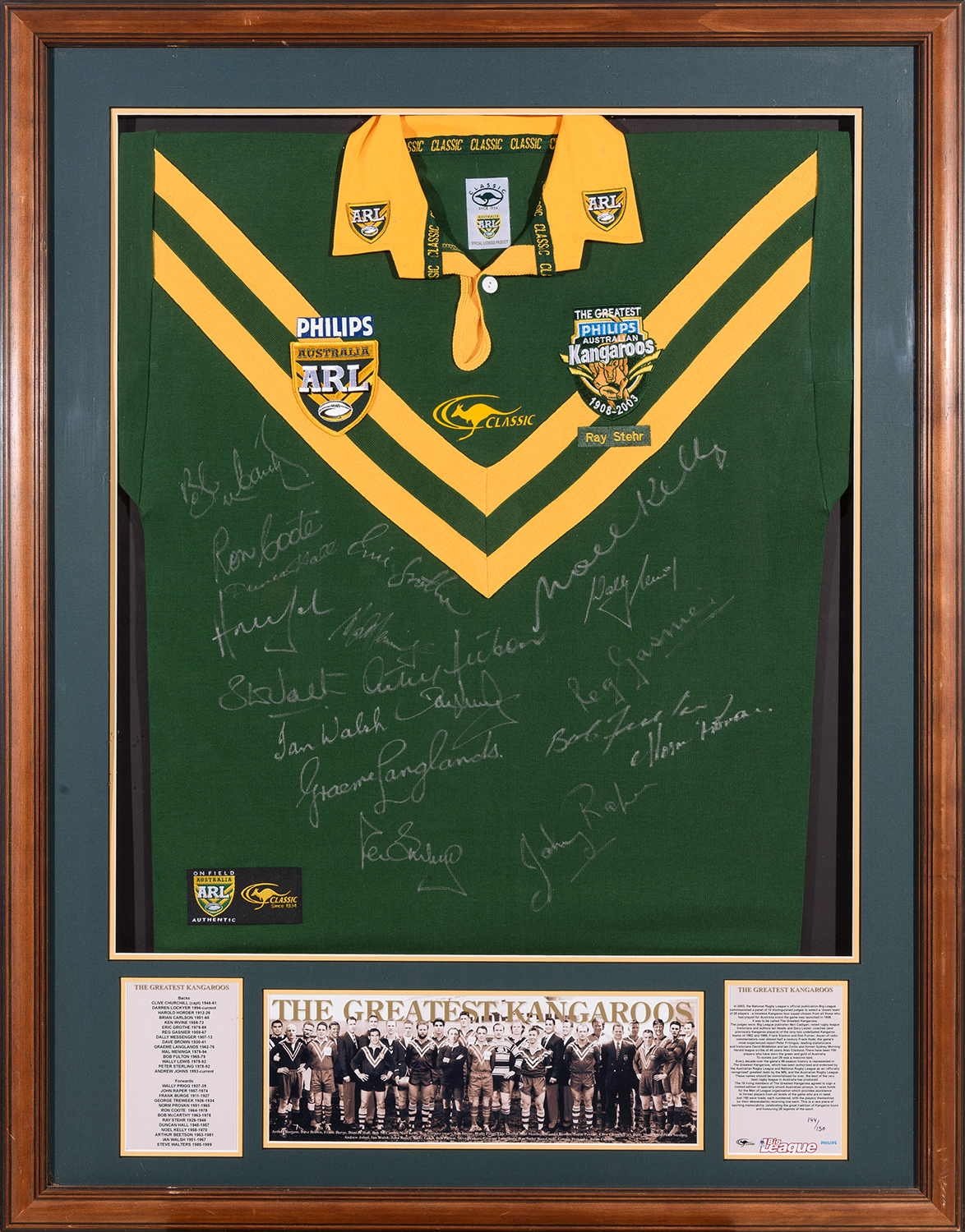 "GREATEST KANAGROOS EVER 1908-2008" JERSEY, SIGNED BY ALL LIVING PLAYERS, WINDOW MOUNTED, FRAMED & GLAZED, OVERALL 85 X 108CM. EX RAY STEHR COLLECTION. (On view only in Sydney, items to be collected from Sydney at purchasers expense).