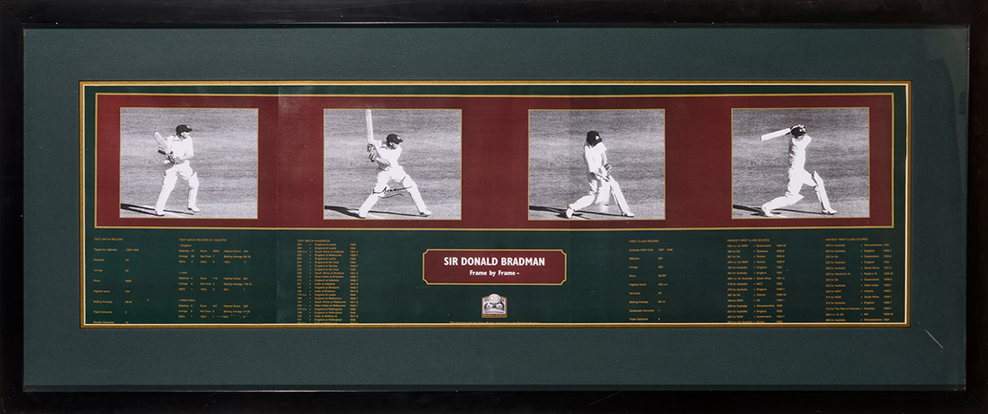DON BRADMAN, SIGNATURE ON "FRAME BY FRAME" PRINT, WINDOW MOUNTED, FRAMED & GLAZED, OVERALL 118 X 50CM
