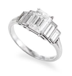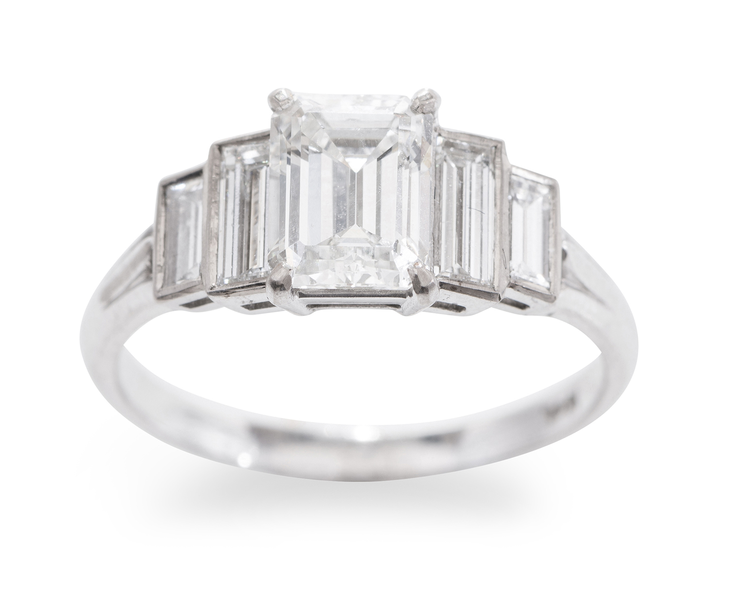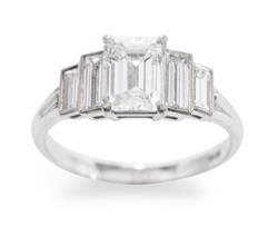 The centrally set emerald cut diamond of 1.46cts, with stepped baguette cut diamonds to the shoulders, mounted in 18ct white gold, ring size N.