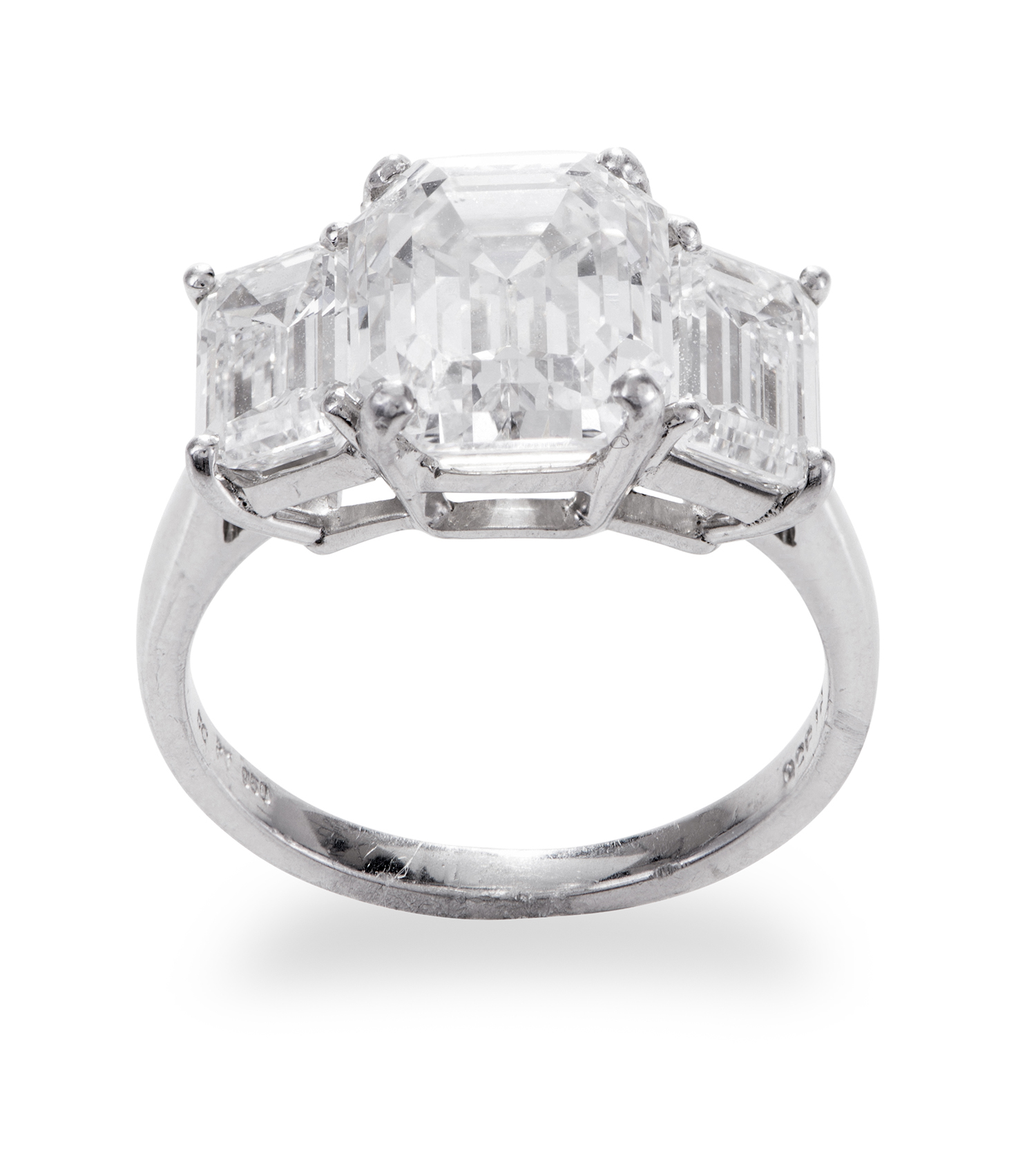 The centrally set emerald cut diamond of 4.09cts, accompanied by GIA report number 11134438 stating colour F and clarity VS1, shouldered by an emerald cut diamond of 0.90cts, accompanied by GIA report number 11690560 stating colour E and clarity VS1 and an emerald cut diamond of 0.93cts, accompanied by GIA report number 11690533 stating colour D and clarity VS1, mounted in platinum, ring size L.