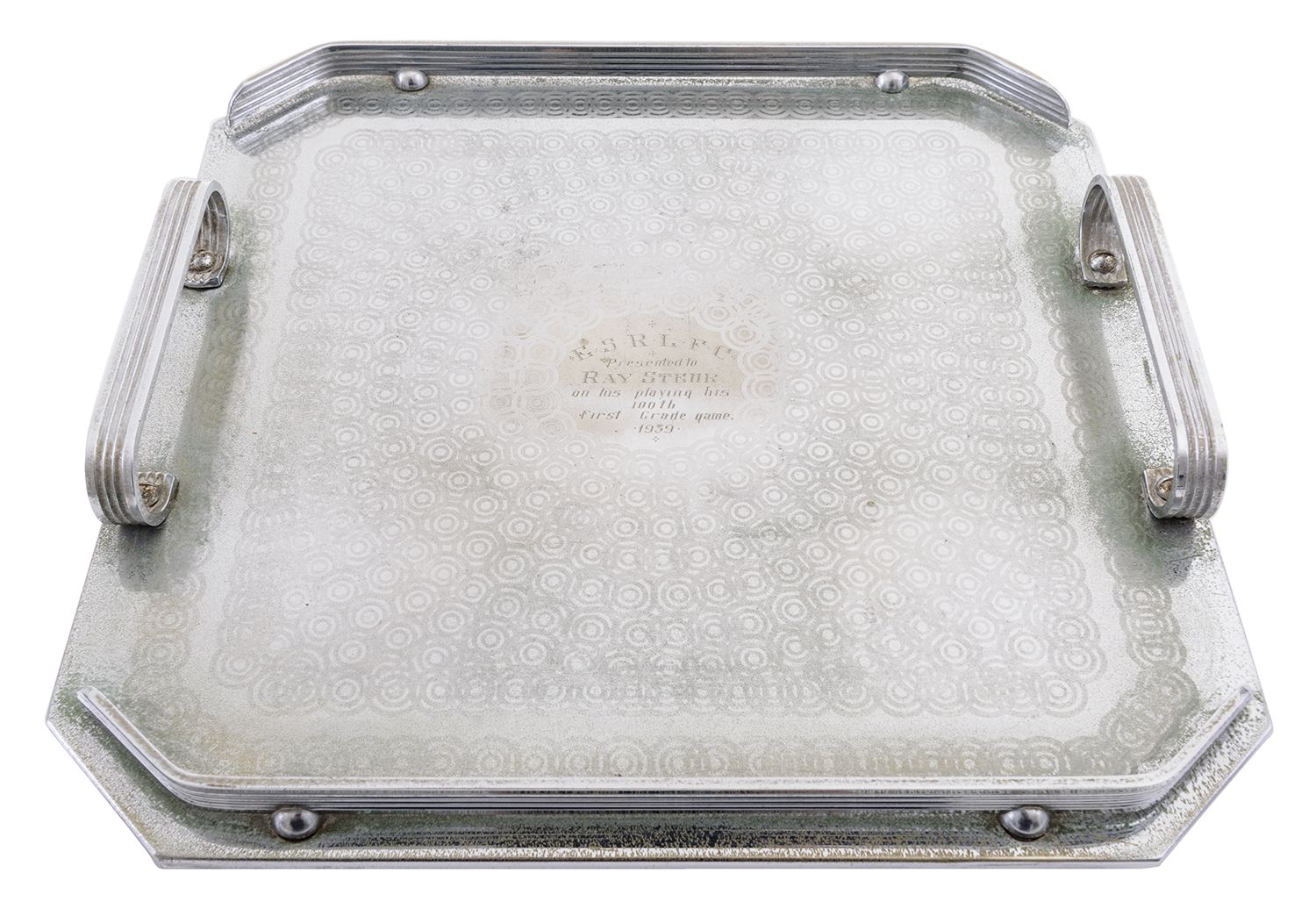 ENGRAVED SILVER PLATE, PRESENTED TO RAY STEHR ON PLAYING HIS 100TH FIRST GRADE GAME 1939. (On view only in Sydney, items to be collected from Sydney at purchasers expense).