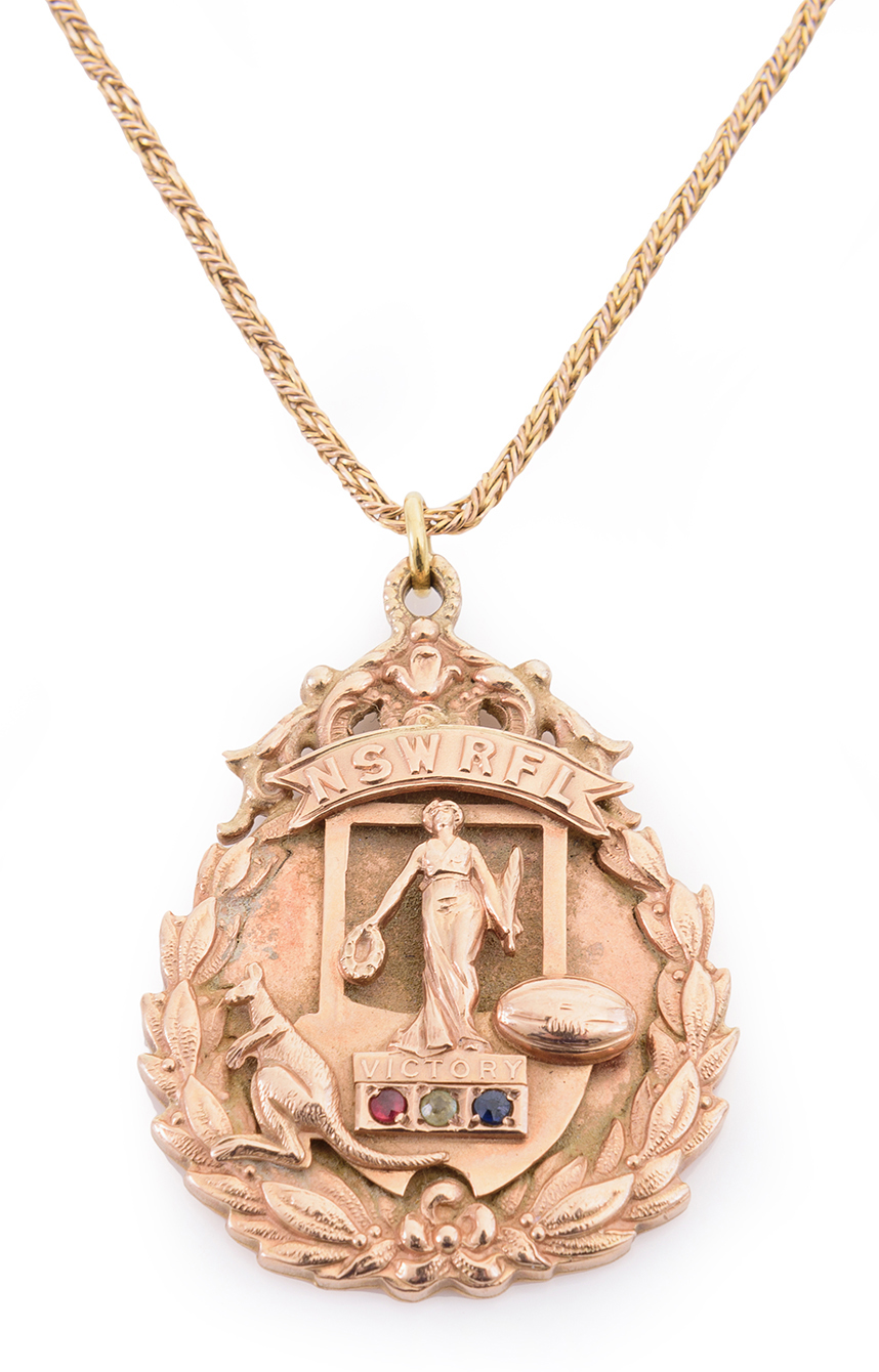 EASTERN SUBURBS: NSWRFU PREMIERSHIP MEDAL DECORATED WITH RUBY, DIAMOND & SAPHIRE, ENGRAVED ON REVERSE "1ST GRADE PREMIERS, 1913, EASTERN SUBURBS DISTRICT CLUB, W.WEBB". (On view only in Sydney, items to be collected from Sydney at purchasers expense).