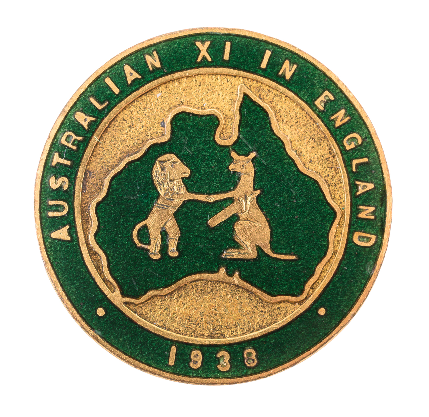 1938 AUSTRALIAN TOUR TO ENGLAND; BADGE SHOWING KANGAROO & LION IN MAP OF AUSTRALIA WITH TEXT "AUSTRALIAN XI IN ENGLAND 1938" EX RAY STEHR COLLECTION, BELIEVED SWAPPED WITH DON BRADMAN OR SID BARNES.
