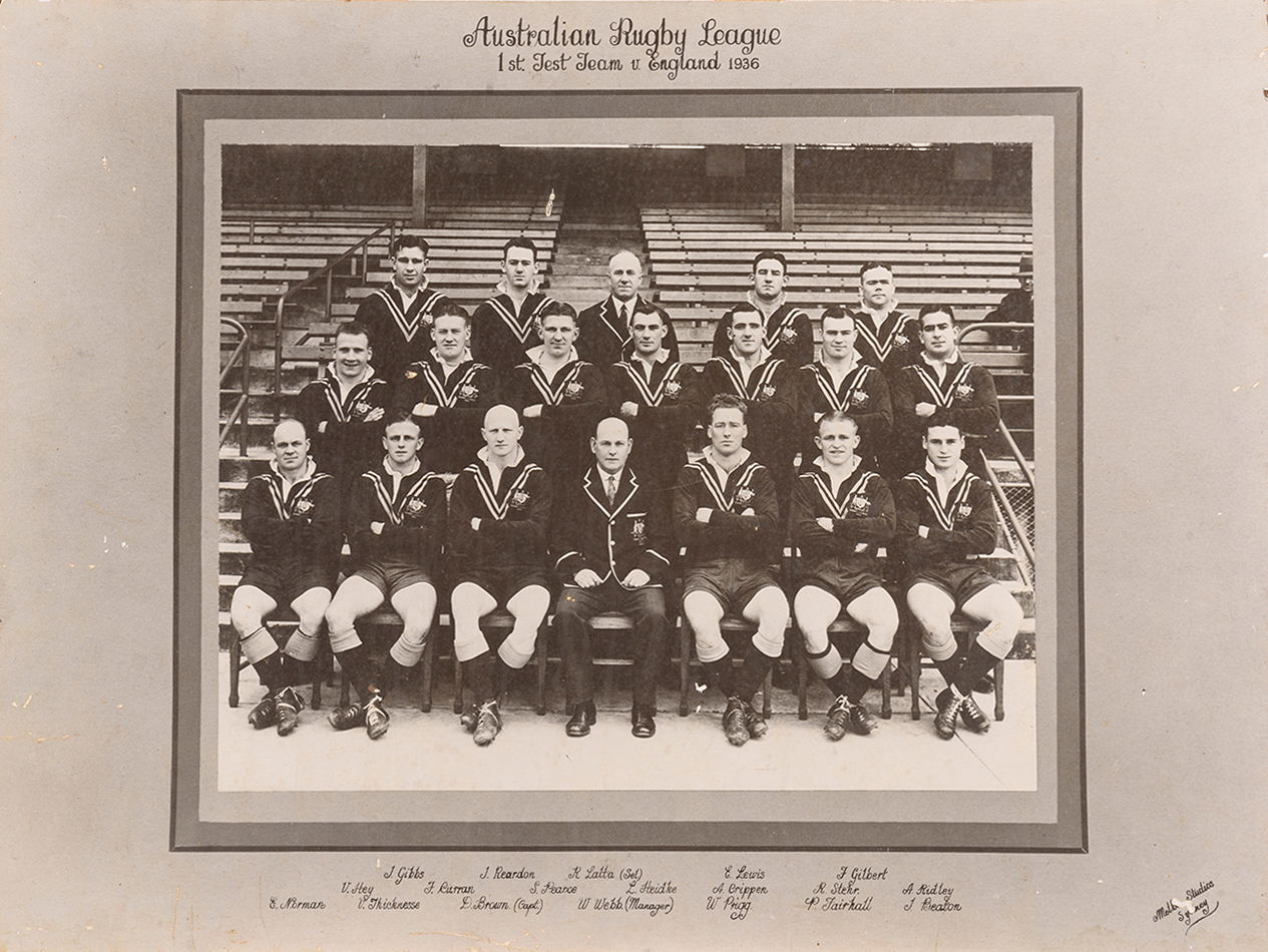 1936 AUSTRALIAN KANGAROOS, TEAM PHOTOGRAPH WITH TITLE "AUSTRALIAN RUGBY LEAUGE, 1ST TEST TEAM VS ENGLAND 1936" SIZE 81 X 61CM. (On view only in Sydney, items to be collected from Sydney at purchasers expense).