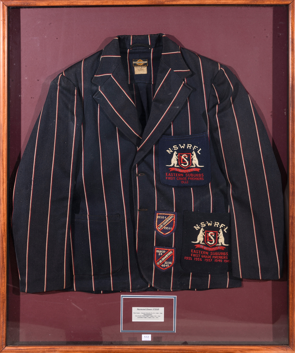 EASTERN SUBURBS; RAY STEHR'S PREMIERSHIP BLAZER EMBROIDED ON POCKET "N.S.W.R.F.L, EASTERN SUBURBS, FIRST GRADE PREMIERS, 1935, 1936, 1937, 1940, 1945" FRAMED & GLAZED, OVERALL 84 X 105CM. (On view only in Sydney, items to be collected from Sydney at purchasers expense).