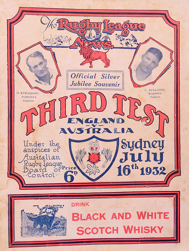 "RUGBY LEAGUE NEWS, OFFICIAL SILVER JUBILEE SOUVENIR, THIRD TEST, ENGLAND V AUSTRALIA, 16TH JULY 1932" EX RAY STEHR COLLECTION. (On view only in Sydney, items to be collected from Sydney at purchasers expense).