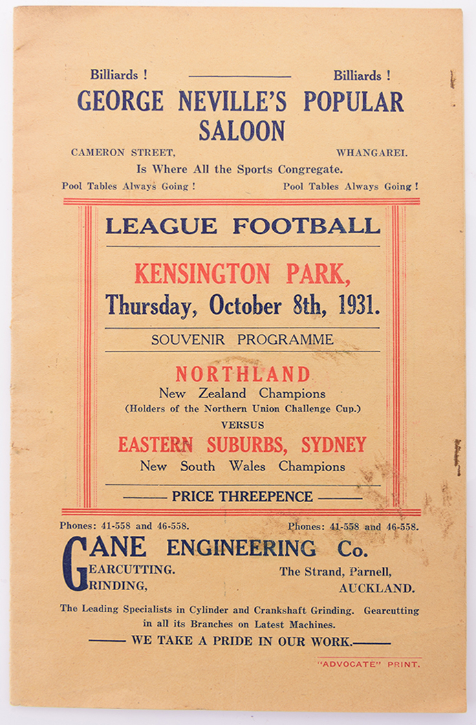 PROGRAMME, NORTHLAND (NZ CHAMPIONS) V EASTERN SUBURBS, 8TH OCTOBER 1931. EX RAY STEHR COLLECTION. (On view only in Sydney, items to be collected from Sydney at purchasers expense).