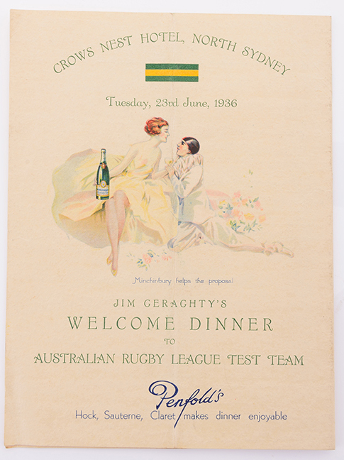 AUSTRALIAN RUGBY LEAGUE TEST TEAM WELCOME DINNER MENU, 23RD JUNE 1936. EX RAY STEHR COLLECTION. (On view only in Sydney, items to be collected from Sydney at purchasers expense).