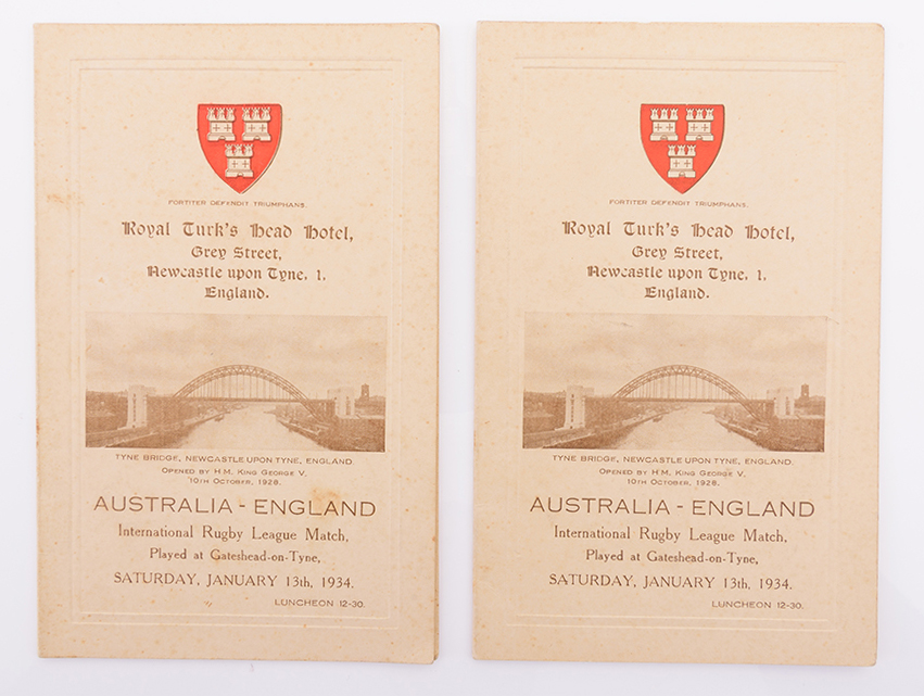 1933-34 AUSTRALIAN RL TOUR TO ENGLAND, TWO COPIES OF LUNCHEON MENU, 13TH JANUARY 1934. EX RAY STEHR COLLECTION.(On view only in Sydney, items to be collected from Sydney at purchasers expense).
