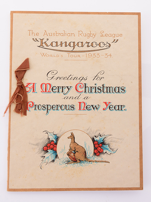 "THE AUSTRALIAN RUGBY LEAGUE KANGAROOS, WORLD TOUR 1933-34, GREETINGS FOR A MERRY CHRISTMAS AND A PROSPEROUS NEW YEAR". EX RAY STEHR COLLECTION. (On view only in Sydney, items to be collected from Sydney at purchasers expense).