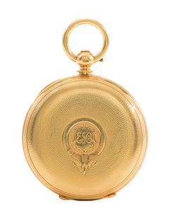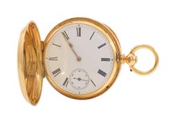 Key wind and set movement, circular white enamel dial with black Roman numerals, subsidiary seconds dial at six, movement signed Waltham Mass, engine turned 18ct gold case, 41mm diameter. Hallmarked Birmingham 1882-83.