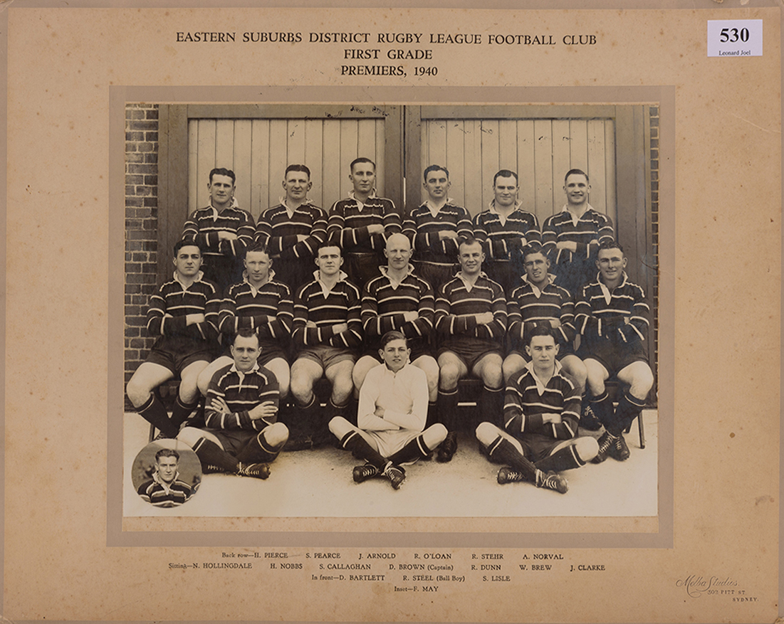 EASTERN SUBURBS: 1940 PREMIERSHIP TEAM PHOTOGRAPH, 37 X 29CM. EX RAY STEHR COLLECTION. (On view only in Sydney, items to be collected from Sydney at purchasers expense).