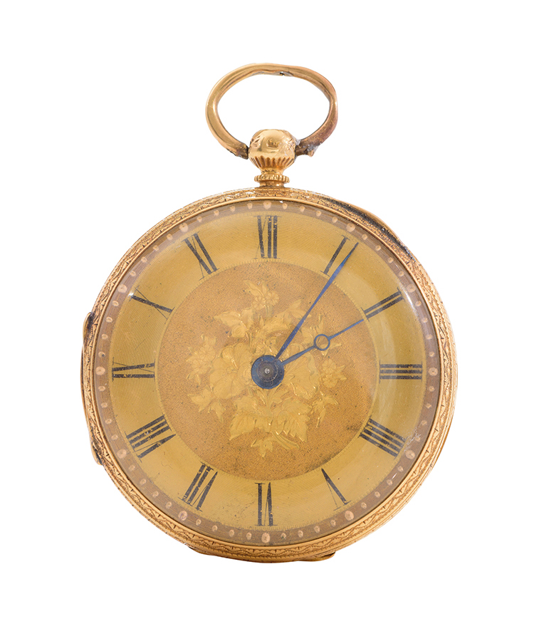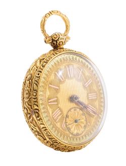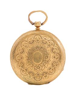 Key wind and set movement, circular gilded dial with Roman numerals, engraved 18ct gold case, 40mm diameter. Hallmarked London, 1874-75.