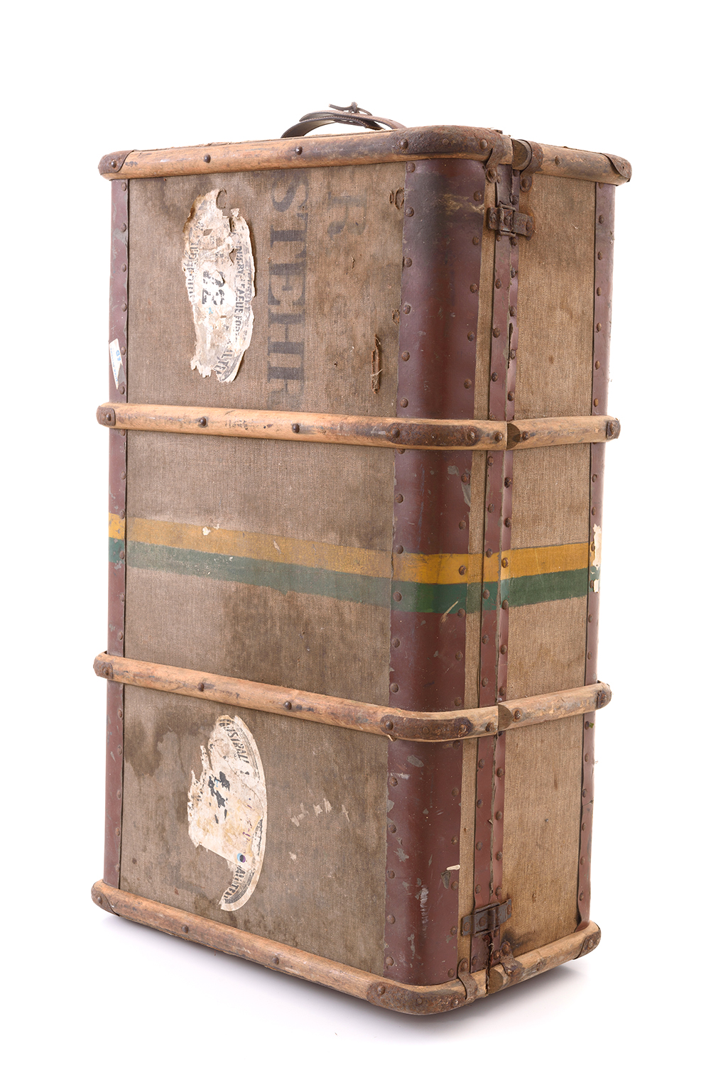 RAY STEHR'S AUSTRALIAN PLAYERS TRUNK, FROM 1933-34 TOUR TO ENGLAND. ORIGINAL HANDLES HAVE BEEN REPLACED BY LEATHER STRAPS. (On view only in Sydney, items to be collected from Sydney at purchasers expense).