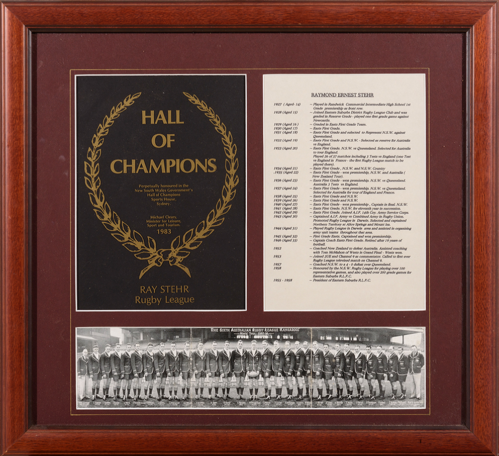RAY STEHR'S "HALL OF CHAMPIONS" CERTIFICATE, WINDOW MOUNTED WITH CAREER OVERVIEW & PHOTO OF 6TH AUSTRALIAN RL KANGAROOS, FRAMED & GLAZED, OVERALL 53 X 49CM. (On view only in Sydney, items to be collected from Sydney at purchasers expense).