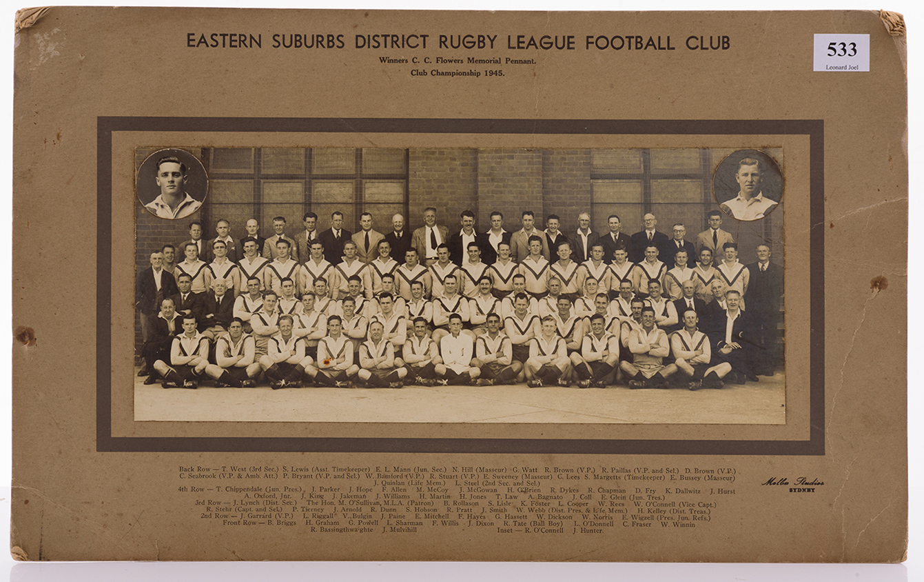 EASTERN SUBURBS: 1945 TEAM PHOTOGRAPH, WINNERS C.C.FLOWERS MEMORIAL PENNANT, CLUB CHAMPIONSHIP 1945, SIZE 41 X 25CM. EX RAY STEHR COLLECTION. (On view only in Sydney, items to be collected from Sydney at purchasers expense).