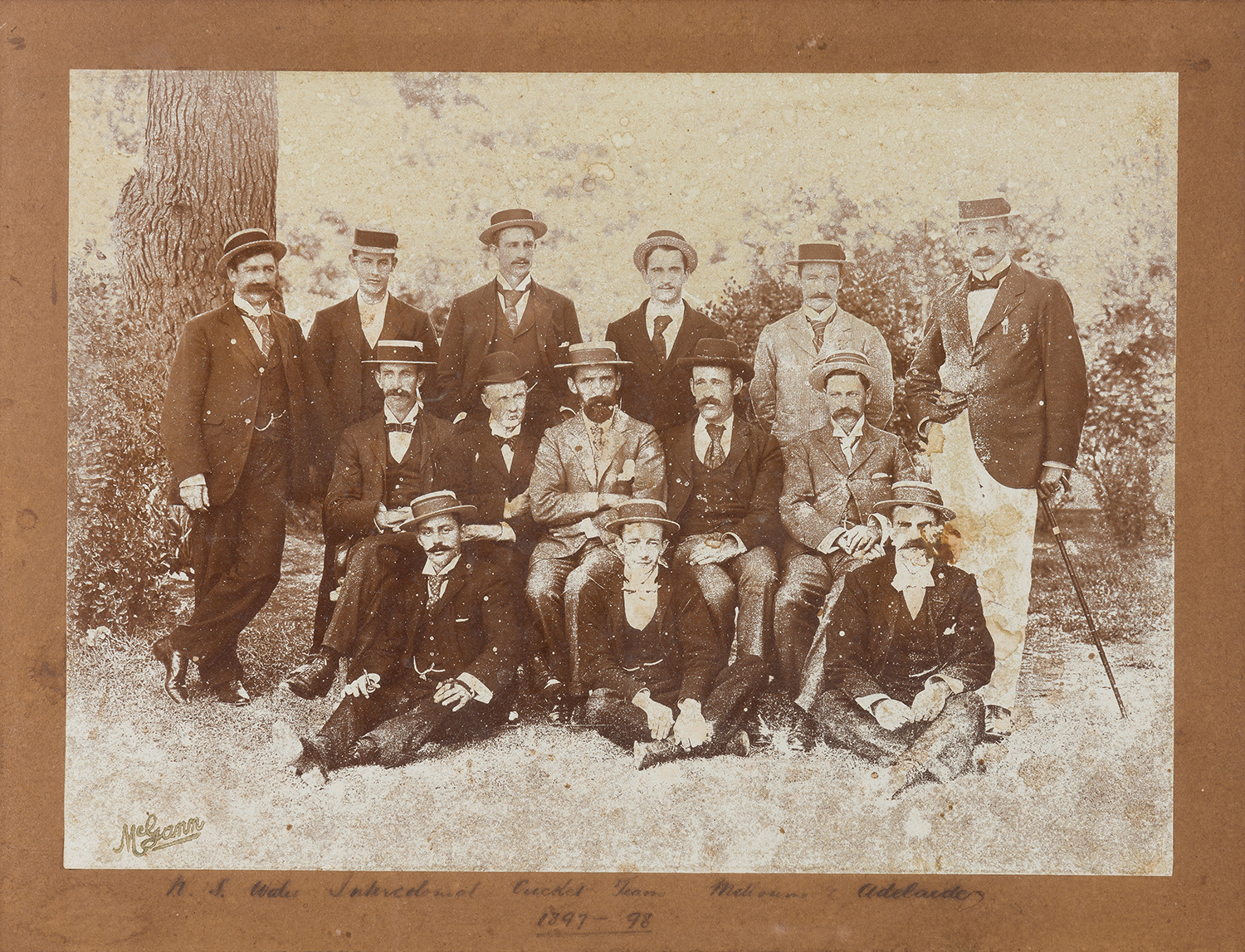 1897-98 NSW INTERCOLONIAL CRICKET TEAM, MELBOURNE & ADELAIDE TOUR, EARLY PHOTO BY MCGANN, INCLUDING TOM GARRETT (CAPTAIN) TRUMPER & NOBLE