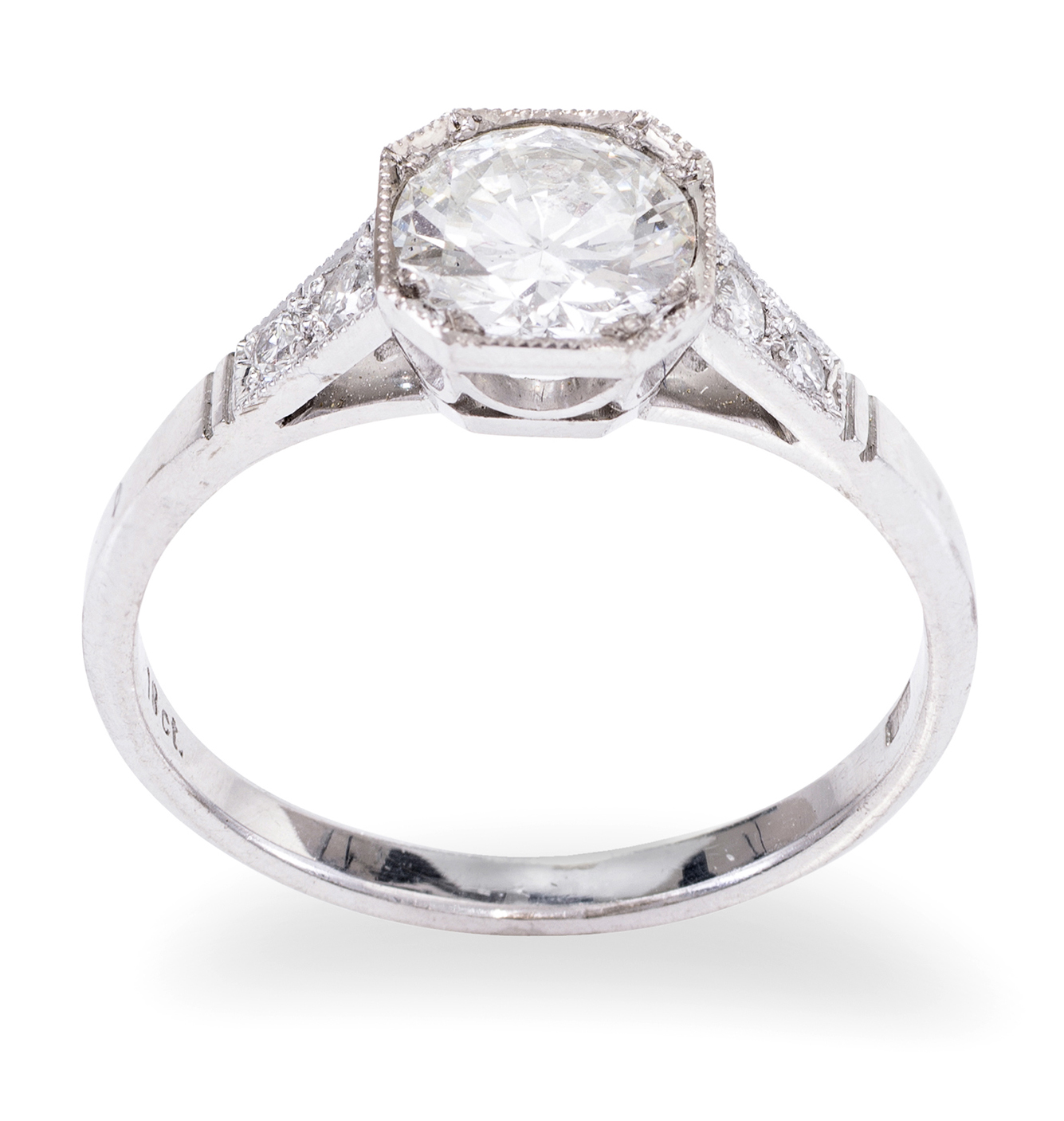The centrally set square cut diamond of 0.98cts having diamond set shoulders, mounted in 18ct white gold, ring size M.